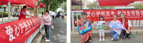 “愛心助考點”服務(wù)站內(nèi),高考專用尺、簽字筆、鉛筆、橡皮等文具整齊擺放,為考生解決不時之需。志愿者們身著統(tǒng)一服裝,手拿“逢考必勝”“加油,你一定可以”“全力出擊 踏歌前行”等祝福手卡,用微笑表達對高考學子的祝福。